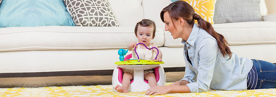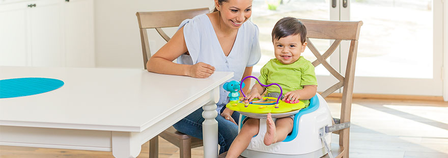 With its included bead maze, mirrored book, elephant toy, and spinning ball, it’s a good thing there’s a snack and cup holder to keep refreshments close at hand!